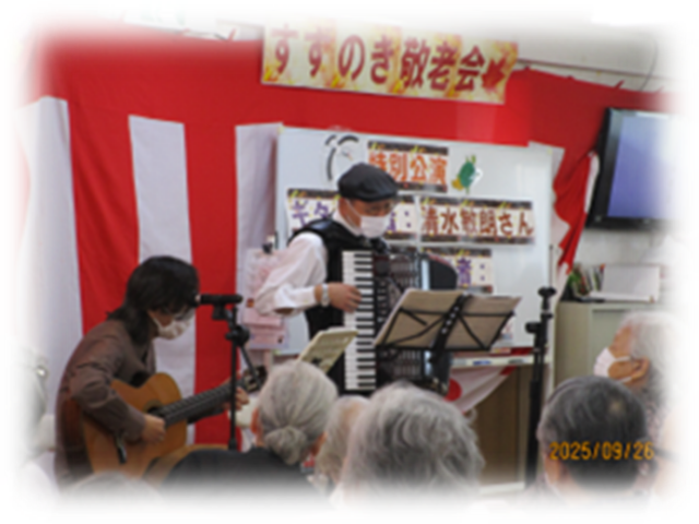 ゲストに、アコーディオン奏者の若林充様とギター奏者の清水敏郎様を招き、演奏会を行って頂きました。「素敵な演奏ですね」「懐かしい」「娘にも聞かせてあげたい」等の声が聞かれ、近くで演奏を聴き皆さんの拍手の大きさに喜びが感じられました。