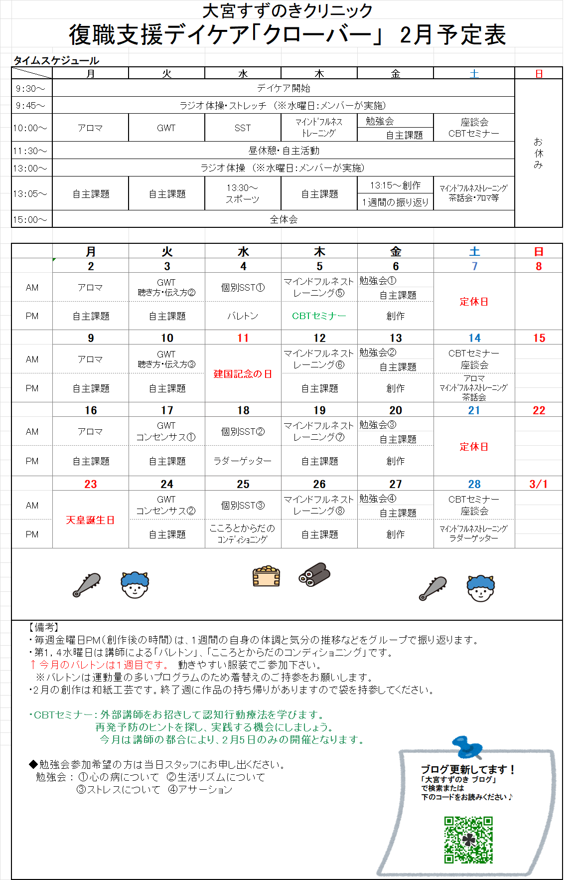 【復職支援デイケア(リワーク)】2月プログラム表